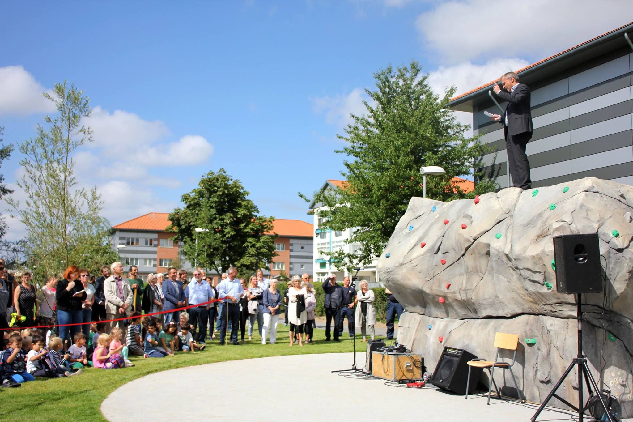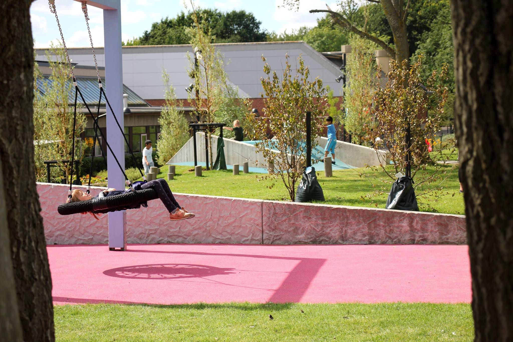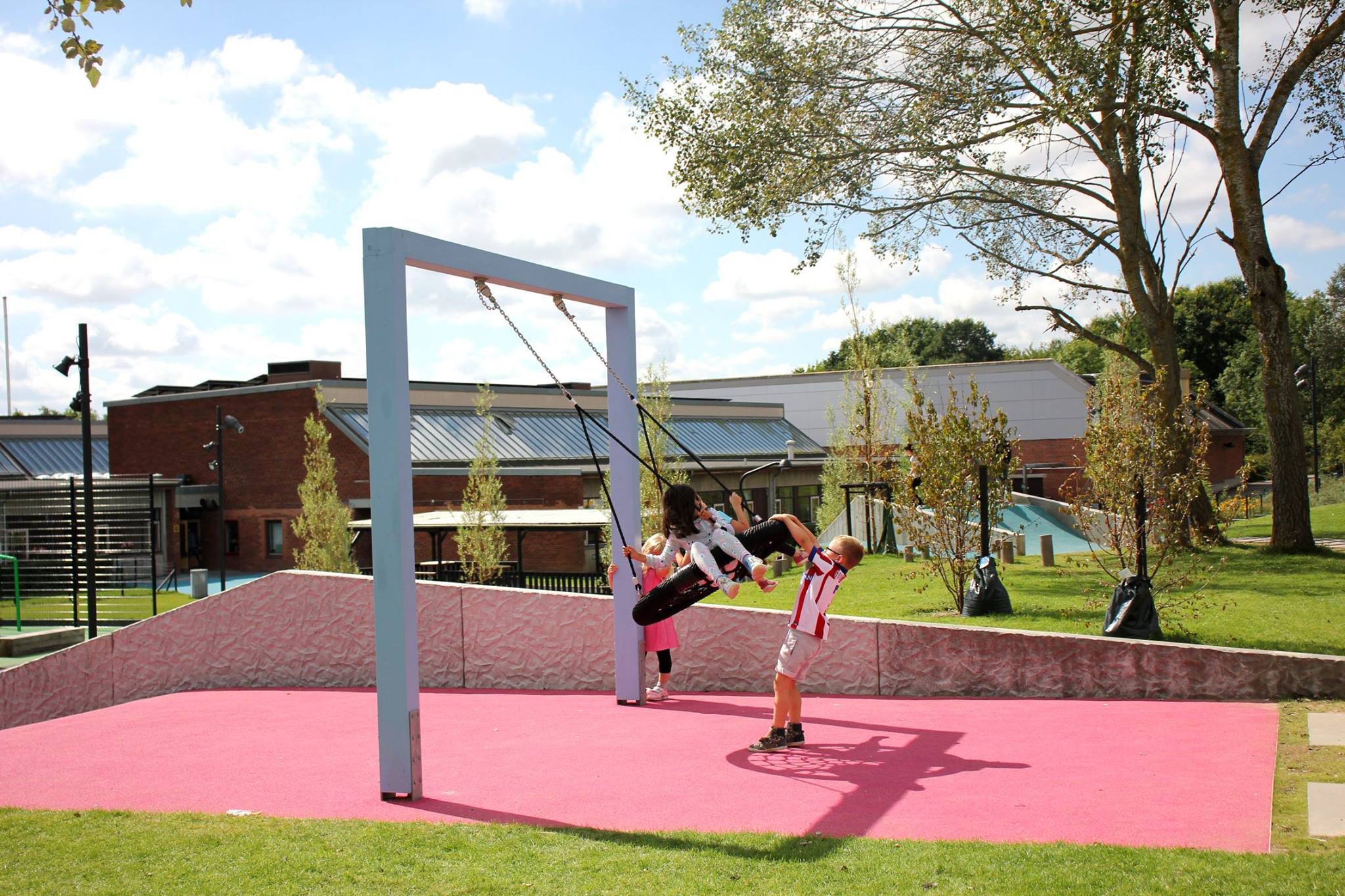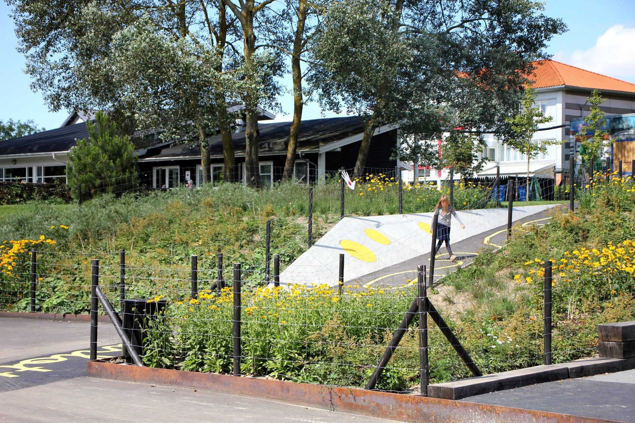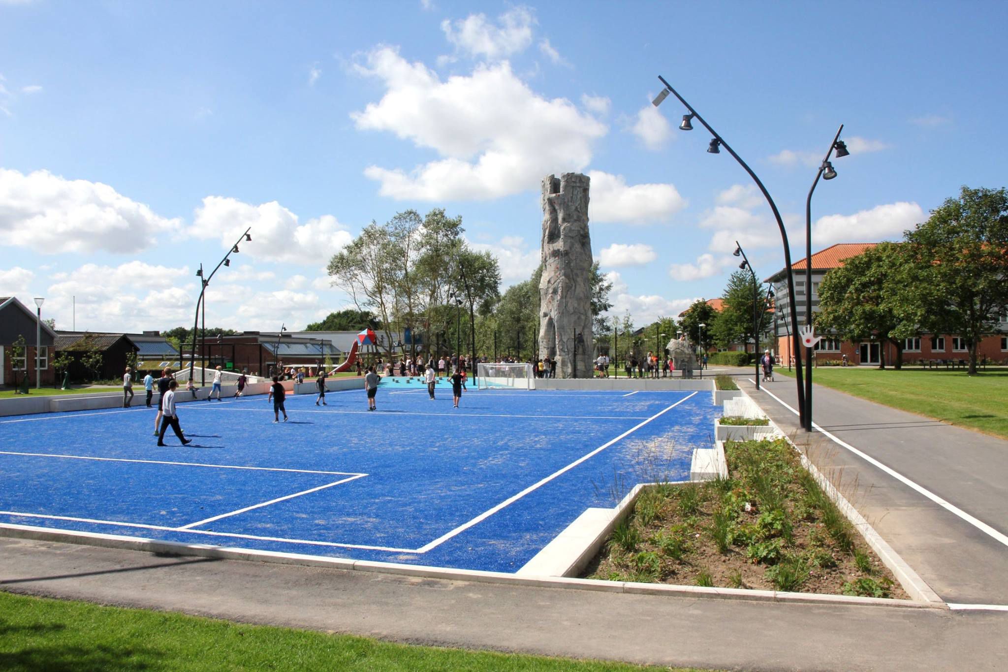 Skolegården er tænkt som et epicenter for ophold og aktivitet, hvor gårdens farvede flader skærer sig på tværs af parkstrøget, hvori forskellige opholds- og aktivitetsrum opstår. Udenfor skolegården, på kanten af parkstrøget, er der opsat et stort udendørs klatremiljø, heriblandt et 15 meter højt klatretårn.
